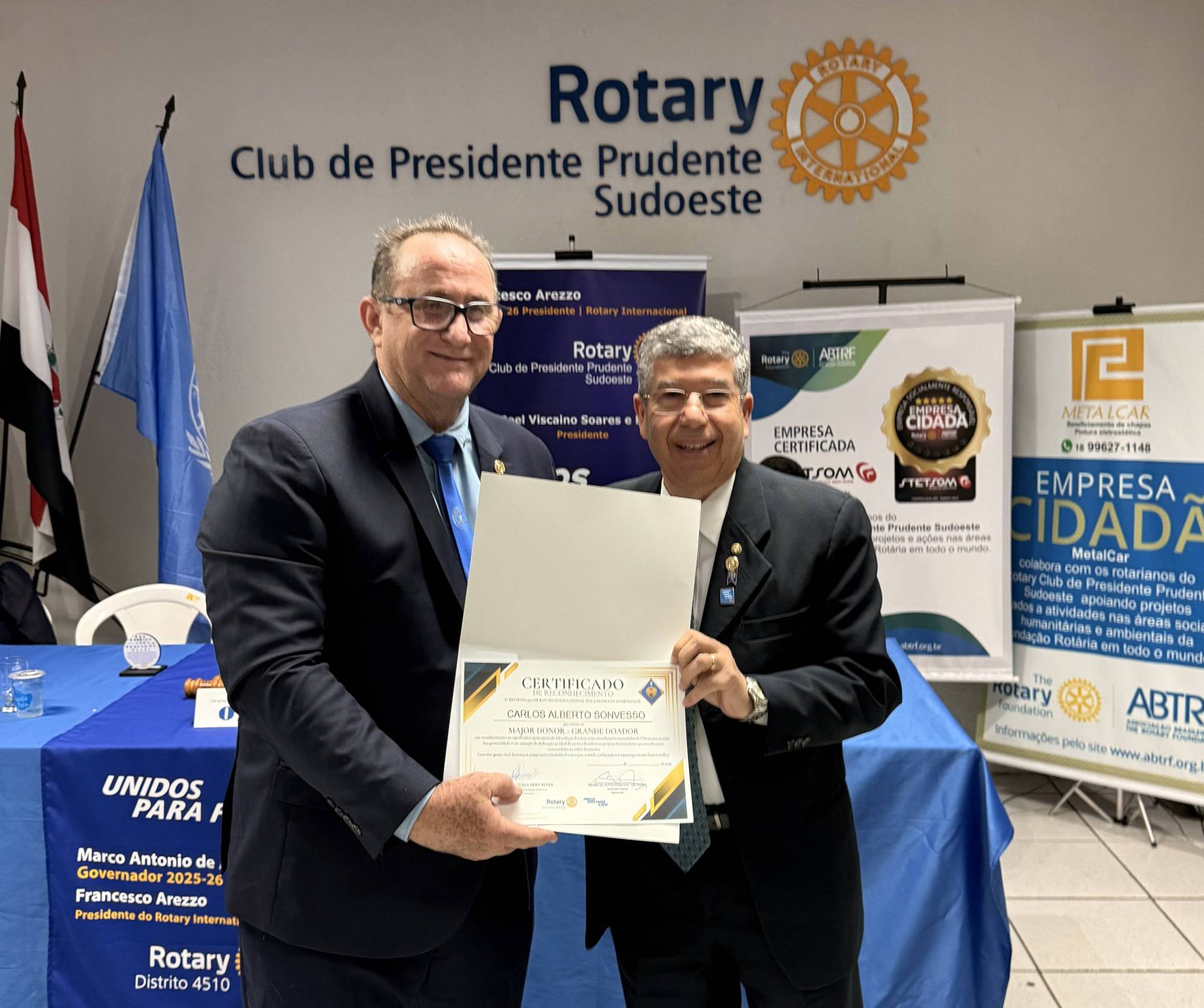 Carlos havia recebido oficialmente o título de Major Donor em 27 de junho de 2025, durante a cerimônia de posse e transmissão de cargos do conselho diretor do Rotary Club de Presidente Prudente Sudoeste. A homenagem feita pelo governador, em sua visita oficial, reforçou a importância desse reconhecimento e o impacto que contribuições como essa geram na missão global do Rotary.