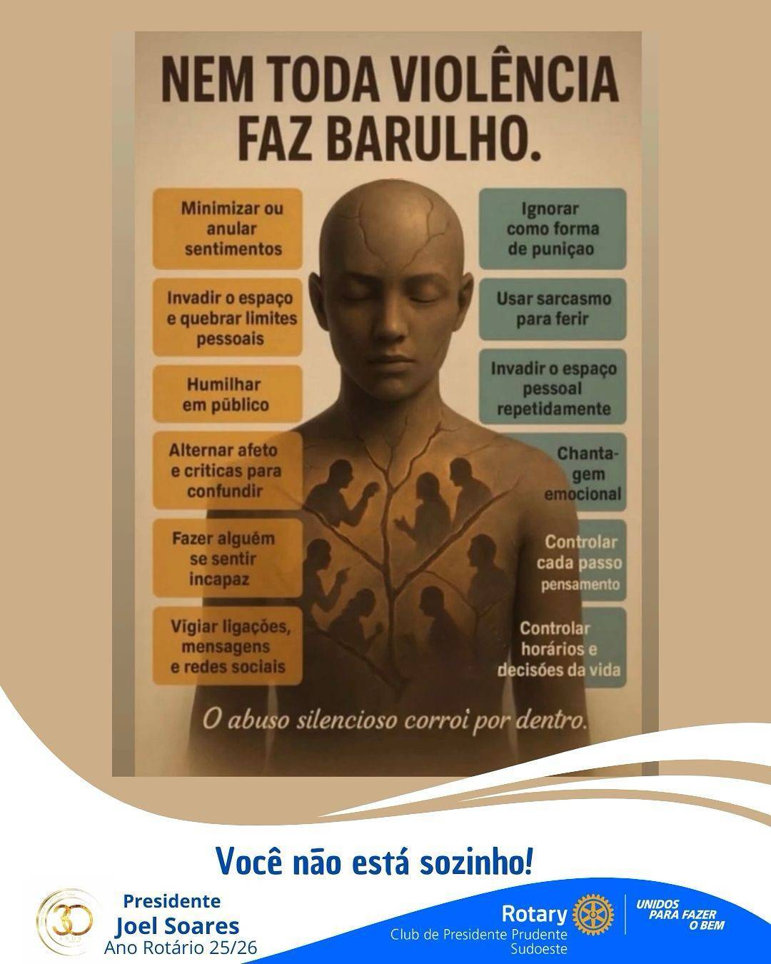 No mês de Setembro Amarelo, dedicado à valorização da vida e à prevenção do suicídio, é essencial ampliar o debate sobre os tipos de violência que não deixam marcas visíveis — mas que corroem por dentro. A imagem compartilhada pela Comissão de Imagem Pública do Rotary Club de Presidente Prudente Sudoeste traz uma mensagem poderosa: “Nem toda violência faz barulho.”