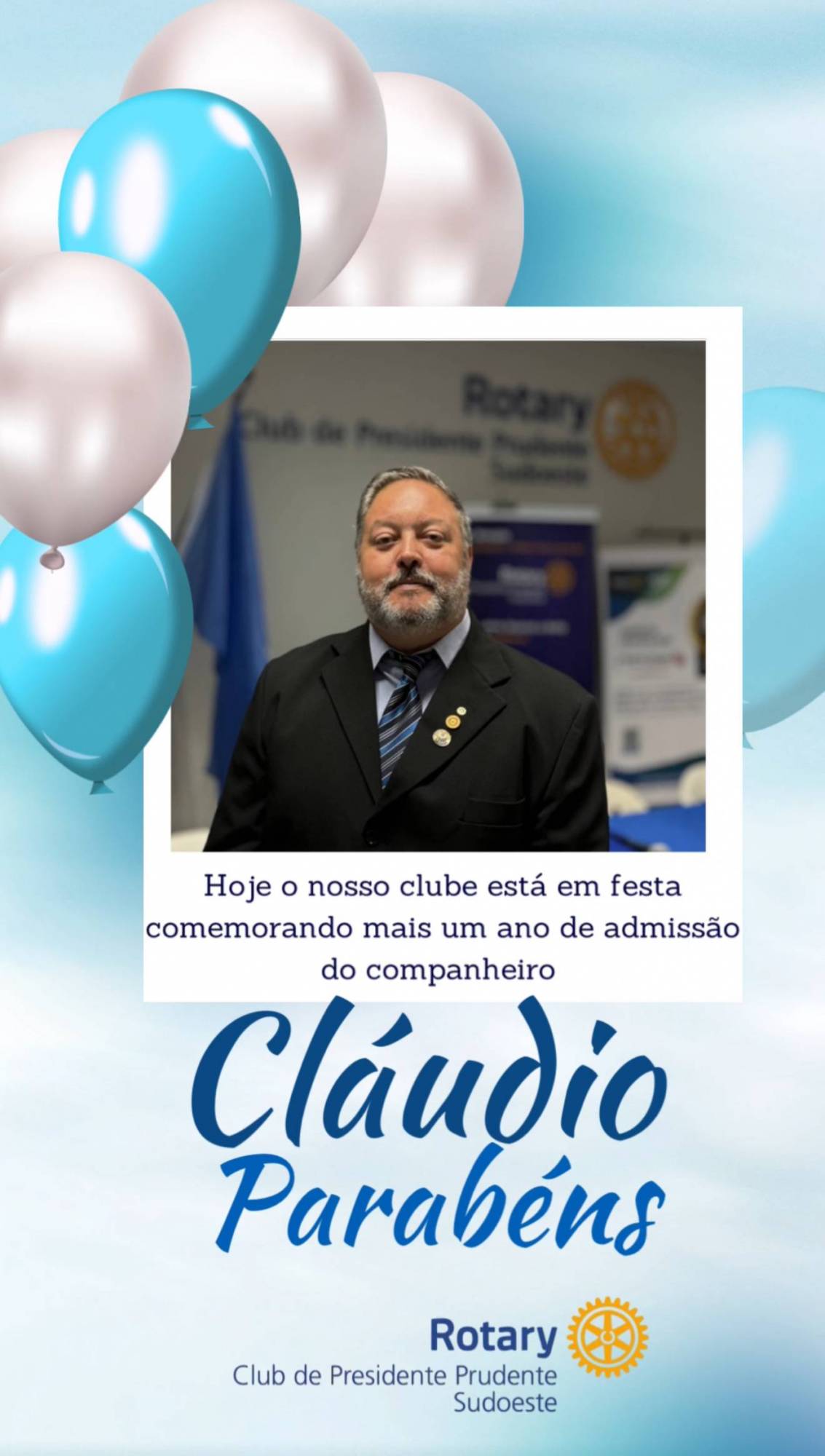 Neste aniversário de admissão, o Rotary Club de Presidente Prudente Sudoeste reafirma sua admiração e gratidão ao companheiro Cláudio Albino dos Santos. Que sua jornada continue sendo guiada pelo lema rotário “Dar de Si Antes de Pensar em Si”, e que muitos outros anos de serviço venham pela frente.