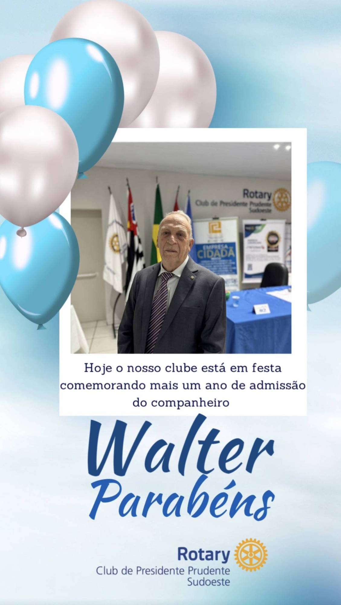 Neste 23 de outubro de 2025, o Rotary Club de Presidente Prudente Sudoeste celebra com orgulho e gratidão o aniversário de admissão do companheiro Walter Alonso, nosso decano — o associado representativo mais antigo em atuação no clube. São 27 anos de serviço rotário, marcados por liderança, comprometimento e inspiração.