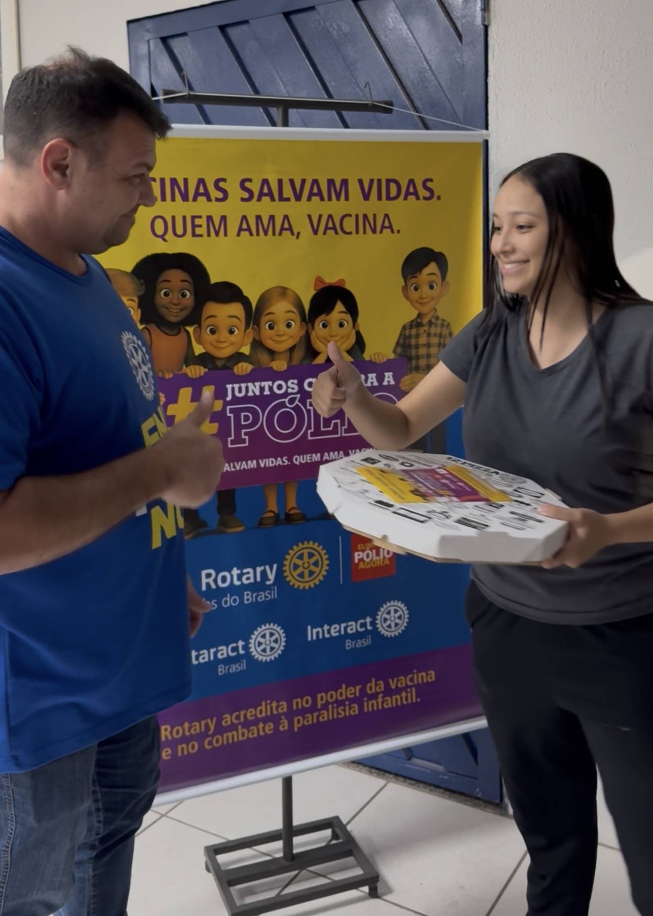 Durante a retirada das pizzas, cada pessoa recebeu um panfleto informativo sobre a pólio, com dados atualizados sobre a campanha End Polio Now e orientações sobre a importância de manter a carteira de vacinação atualizada.